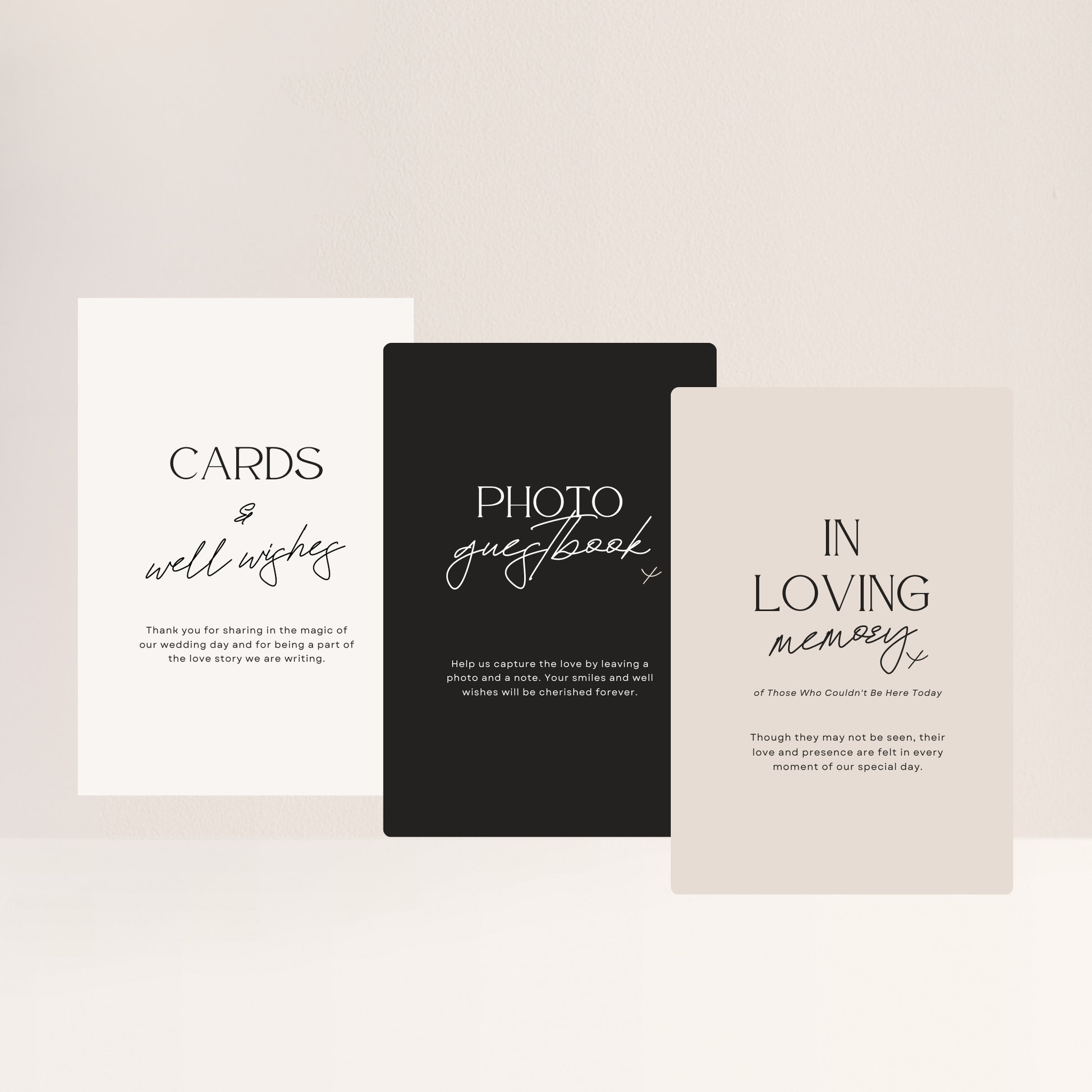 You can choose 2 or 3 additional signages in this package and comes with either x1 Cards and well wishes, x1 Photo guestbook or x1 In Loving Memory